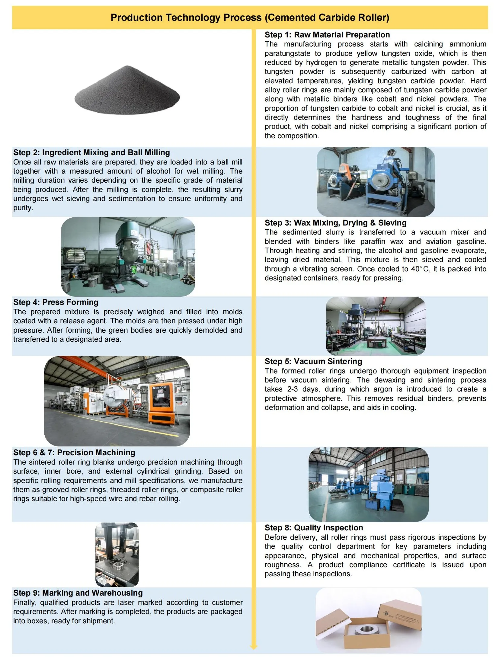 حلقههای رول کاربید سیمانی (همچنین به عنوان حلقههای رول کاربید تنگستن شناخته میشوند) رسانایی حرارتی عالی را ارائه میدهند و از نظر مقاومت در برابر حرارت، مقاومت در برابر سایش و استحکام، با حداقل کاهش سختی در دماهای بالا، بهتر از نسل اول رولهای چدنی و فولادی با سرعت بالا عمل میکنند. آنها که در کنار آسیاب های مفتولی پرسرعت توسعه یافته اند، اکنون به طور گسترده در غرفه های تکمیلی برای تولید سیم پرسرعت، میلگرد و میلگردهای فولادی تغییر شکل یافته استفاده می شوند.
